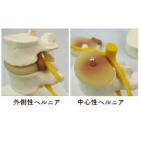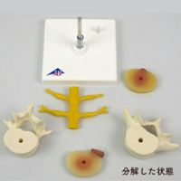 第4・5腰椎間に2種類のヘルニアを付けたモデル。ヘルニア病部付き椎間板は取り替え可能で,神経を圧迫している状態をそれぞれ見る事ができます。