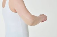 ・筋肉を伸ばした状態でテープの端を貼り付け、テープを引っ張らないようにして少しずつ貼ってください。